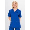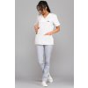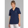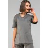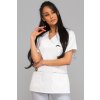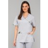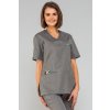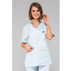 Halenka má projmutý střih s délkou na boky, mírně zaoblený výstřih do "V" s barevnou lemovkou, zeštíhlující prošití, boční rozparky a dvě prostorné kapsy ozdobené lemovkami.